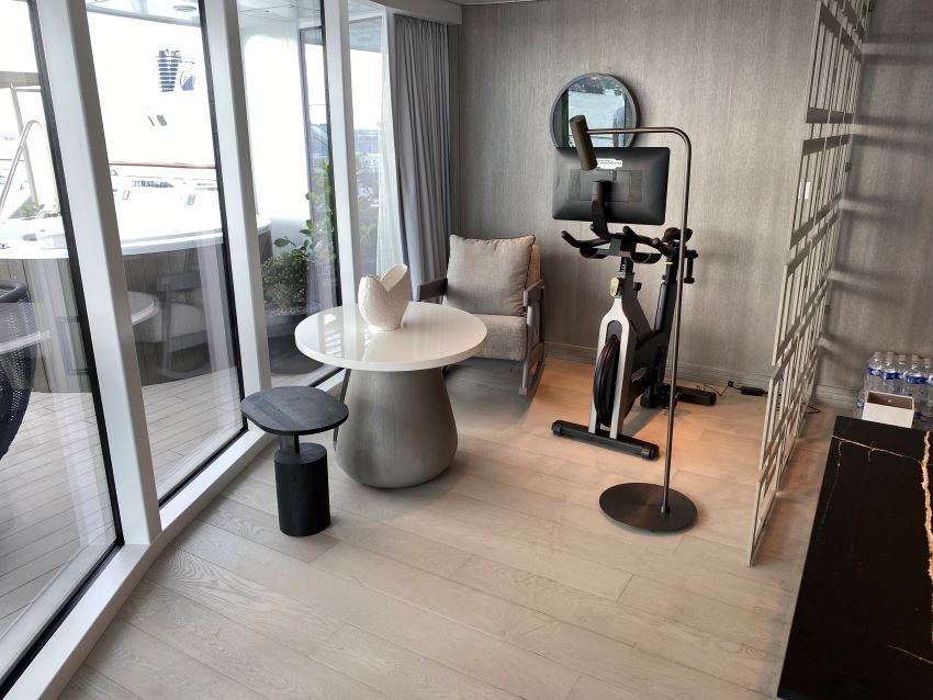 While most passengers have to go to a gym if they want a workout, those fortunate enough to book this suite have access to their own exercise bike to hop on any time they want. And to recover, there is a private hot tub on the balcony just on the other side of the window.