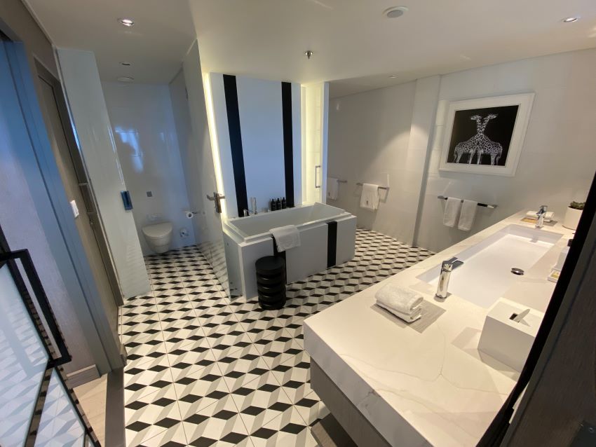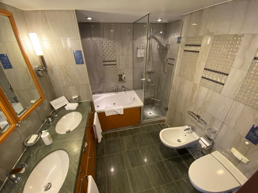 This suite on a Celebrity ship features a bathroom that “just” a little larger than what you typically find. Here, the extra wide single sink features his/hers faucets, there’s a complete water closet, and a bathtub with separate shower area around the corner.
