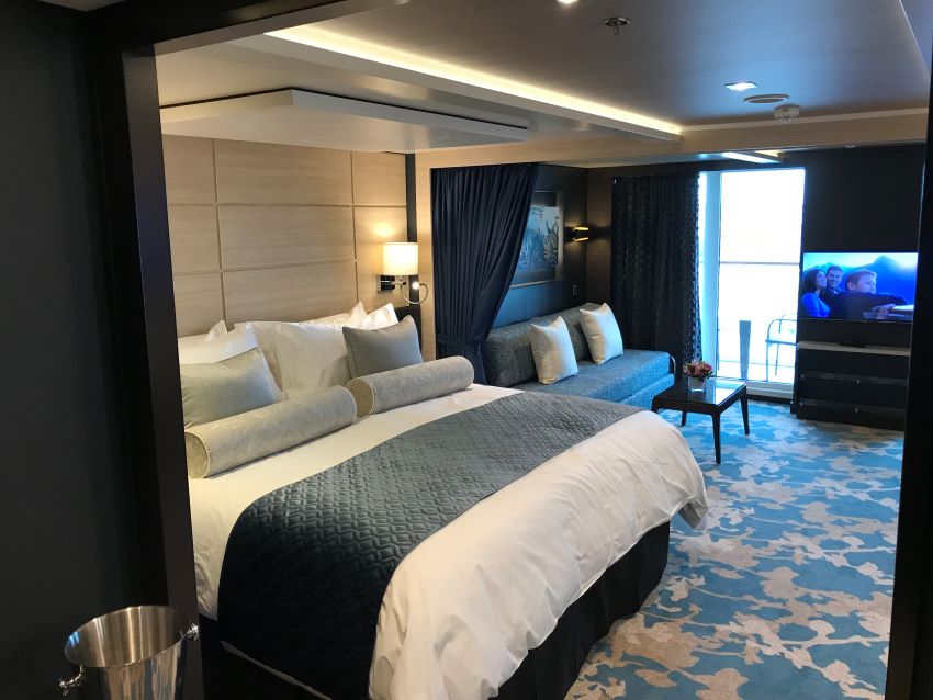 A typical cabin measures about 180 square feet. This suite is considerably larger, complete with its own living room seating area next to the big screen TV and an ultra-large bed. It would be hard not to be comfortable staying here.