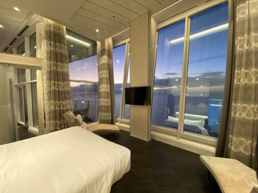 Room with a view? That’s what high-end passengers would expect. This room delivers with two-story floor-to-ceiling windows to give you a sweeping view of everything.