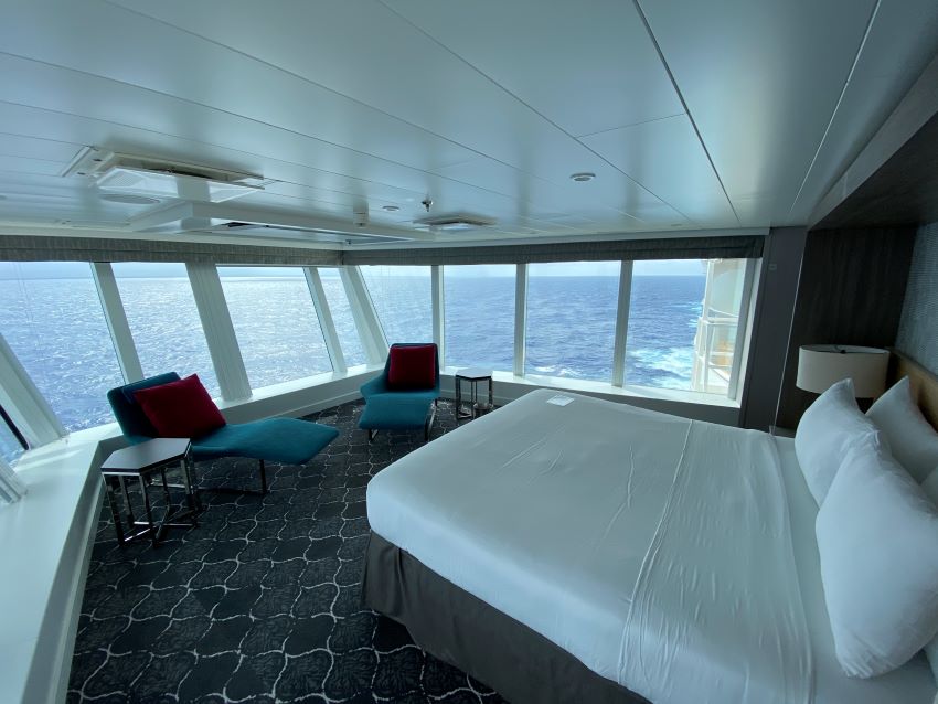 How about a bedroom that has a complete wrap-around window? This Royal Caribbean cabin is right above the ship’s bridge, and it actually juts out from the side of the ship. That means from horizon to horizon you have an uninterrupted view.