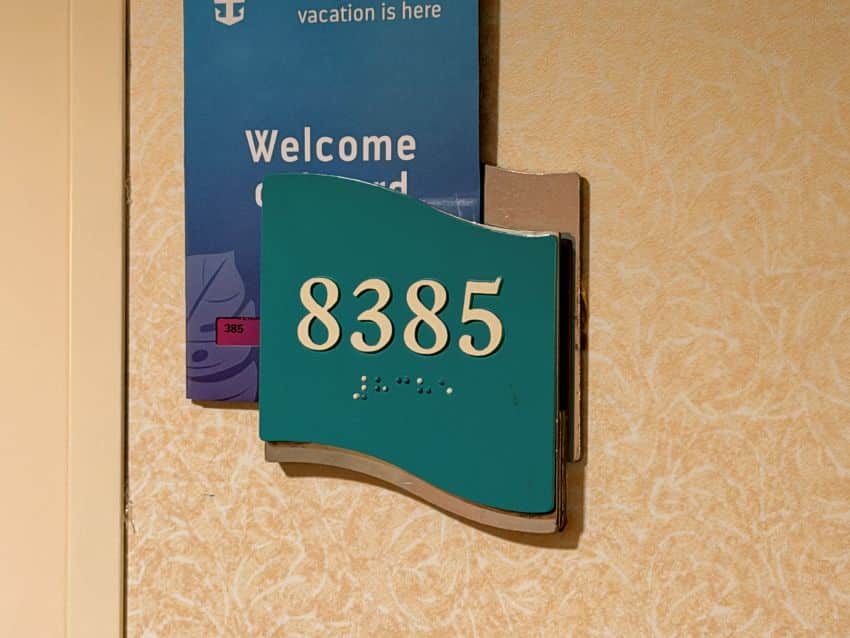 On Royal Caribbean the door markers can give you directional clues. Some may have an outline of the ship, which will be pointing forward. Others have a small arrow (like you see on the gas gauge of your car) pointing the way ahead. More hidden are signs on older ships that have signs in the shape of a wave. The higher end of the wave is the side toward the way to the front of the ship.