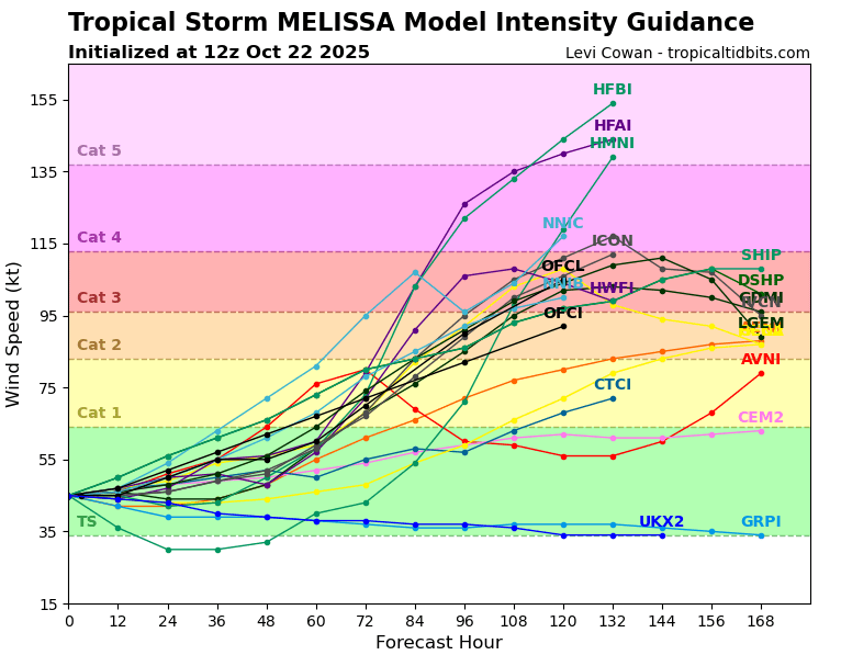 Current projections on strength are widely varied. Some models have Melissa becoming a strong Category 4 hurricane while others have it only staying as a tropical storm: