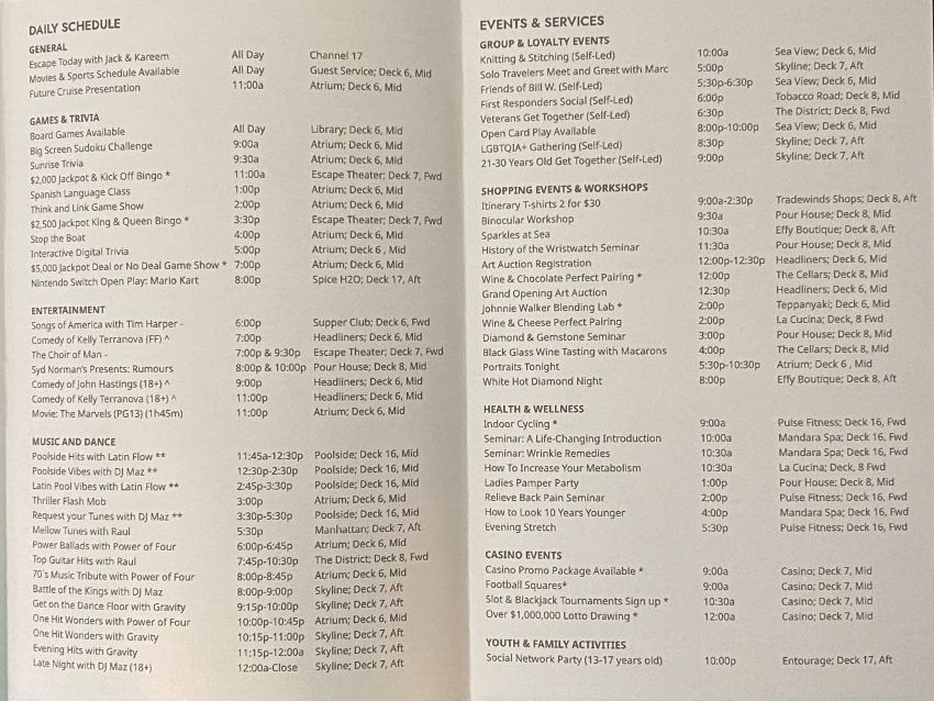 In addition, there are plenty of activities put on by the staff. Below is a sample of the activities on board a ship in just a single day: