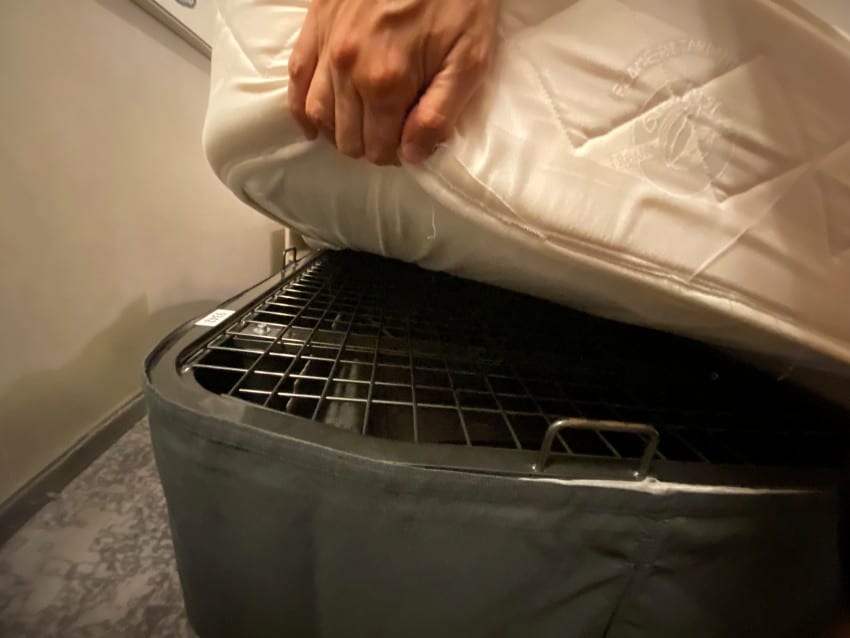 Therefore, the entire beds are thinner and lighter than what you might find in a traditional hotel. For instance, the bed frame is a simple metal frame with a wire mesh to support the bed. The mattress simply sits right on top of the metal.
