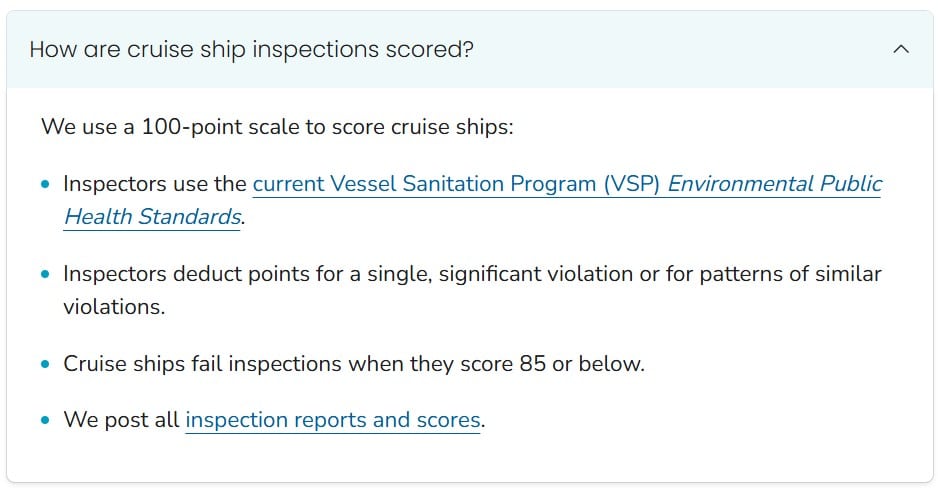 If you have an upcoming cruise, you can check the latest health inspection score and report for your ship here.