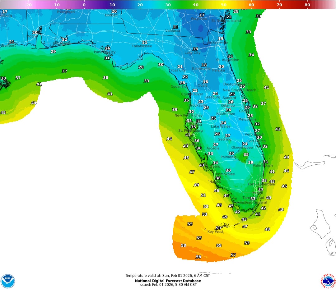 Fort Lauderdale saw the same 35-degree weather as Miami. Further north, the temperatures dropped even more. Cocoa Beach (home to Port Canaveral) saw lows in the 20s this morning!