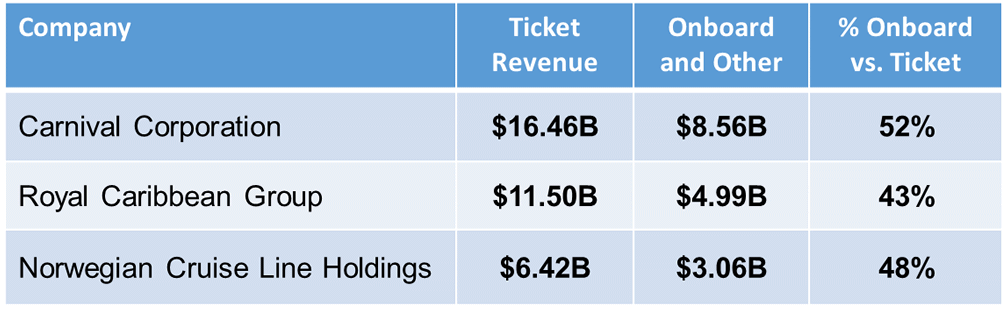 Specifically, the cruise companies break down their revenue into cruise fares (Ticket Revenue) and “Onboard and Other” revenue. This second category includes everything mentioned above, from alcohol to the spa to internet service, photo sales, excursions… even art sales.