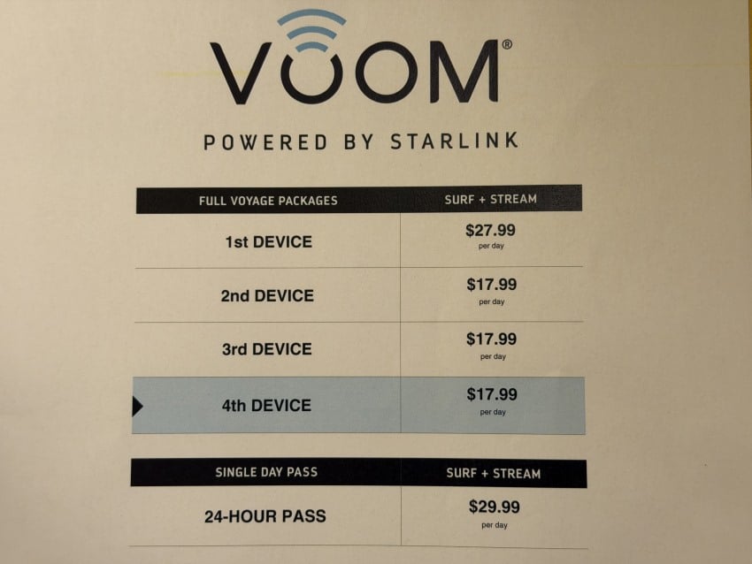Note that Royal Caribbean used to offer a simpler (and cheaper) “Surf” package that only allowed web browsing. With the move to Starlink, that seems to have gone away, and only one package is available.