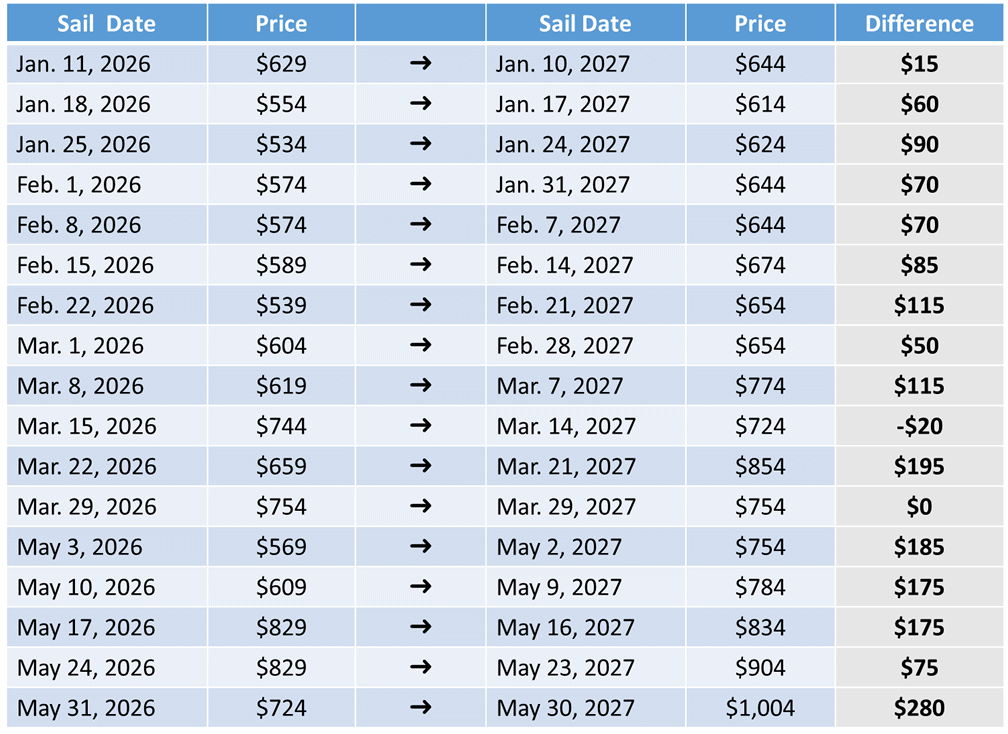 The table below shows the headline fare for one cruise as an example to give you some actual numbers. This cruise is aboard Carnival Celebration on a 7-day cruise departing Miami. Note that there are no sailings offered on this ship in April 2027 to compare to April 2026, so we’ve left that out of the chart.