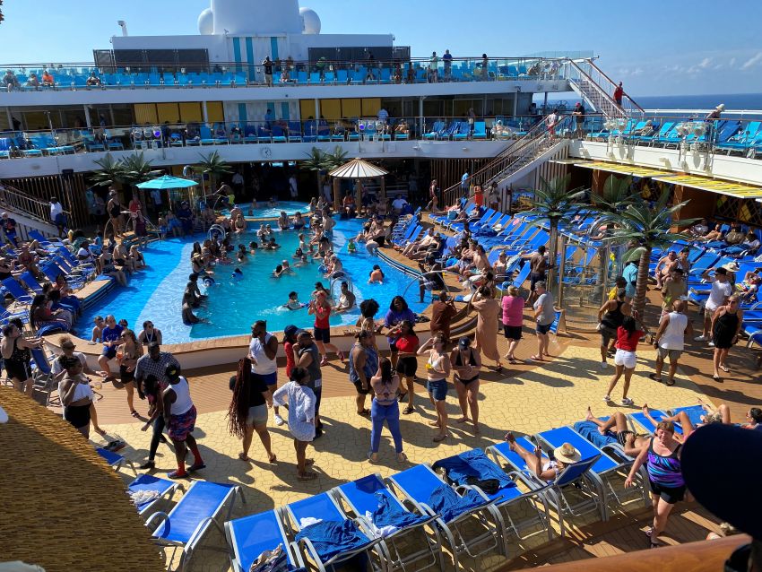 A crowded pool deck on a cruise ship