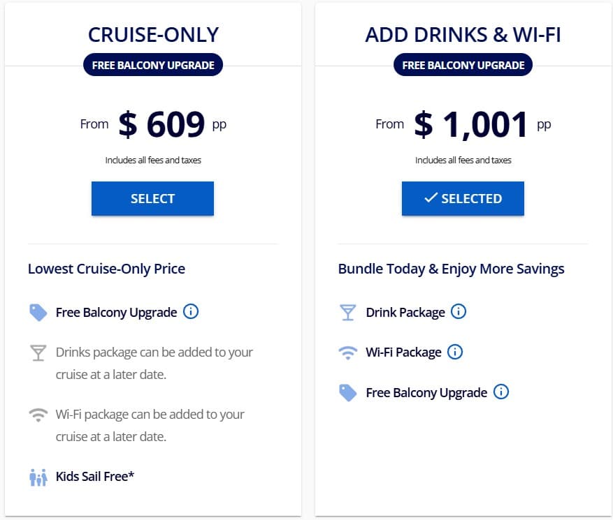 For instance, in a recent 7-day booking we saw a baseline price of $609 per person for a balcony cabin, but $1,001 per person for the drinks and wi-fi deal.